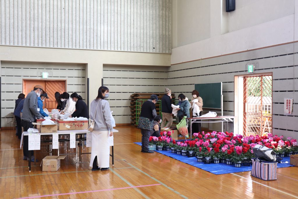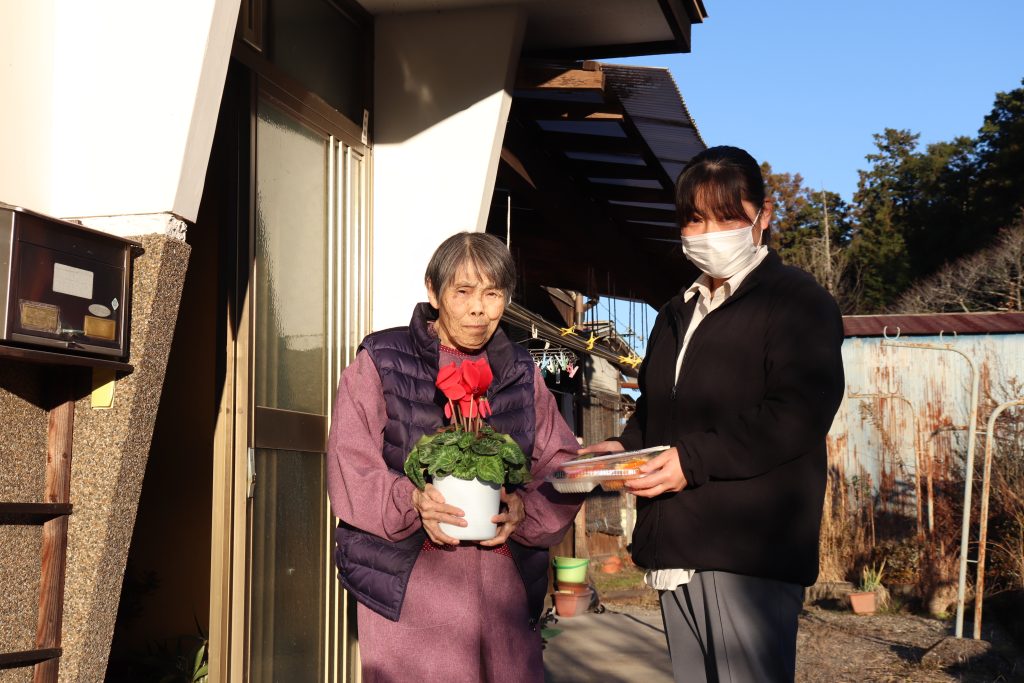 民生委員さんと地域福祉推進委員さんが、70歳以上のひとり暮らしの方へ「ちらし寿司弁当」と、阿木高校の生徒さんが心を込めて育てたシクラメンの鉢植えをお届けしました。